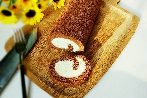 7.将蛋糕卷卷起来,可可粉加一点水兑开溶解,在小熊团上画上眼睛,鼻子和嘴巴,可爱的小熊蛋糕卷就做好了。
