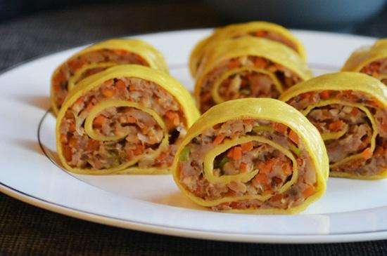 12.用勺子将肉馅均匀地涂抹在鸡蛋饼上,厚度0.5CM左右,从一边卷起,卷好后,包口朝下。