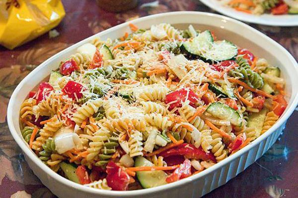 6、将盘中依次铺入小片的生菜、圣女果、意面、藜麦和牛肉粒,可以依自己口淋一些沙拉酱或番茄酱。