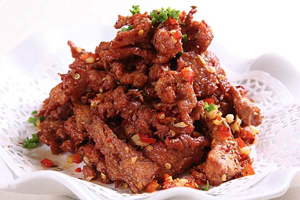 迷你薯饼250克、牛里脊肉200克、青尖椒1/2个、红尖椒1/2个,干红辣椒丝适量、盐1小勺、辣椒粉1/2大勺、孜然粉1/2大勺、糖1/2小勺、葱姜末适量、鸡精适量,料酒1小勺、生抽酱油1大勺、蚝油1小勺、浓稠水淀粉1大勺。