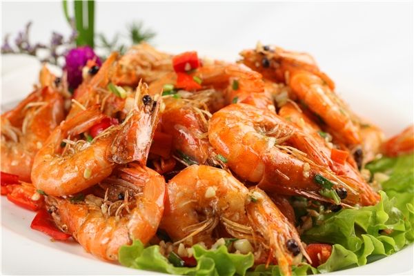 5,盛装容器,装饰完整的熟虾,撒上小香葱碎即可。