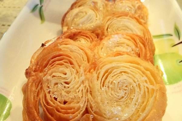 5.将油皮和油酥分别均匀分成15份,将油皮搓圆压扁后包入油酥,封紧口,搓圆,再压扁;