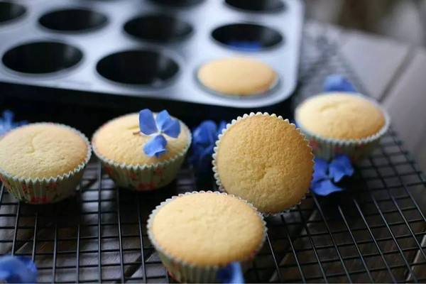 8、出炉之后拿出放置晾凉即可,方子的小纸杯蛋糕支撑力不错。亦可挤压奶油作为奶油小蛋糕。