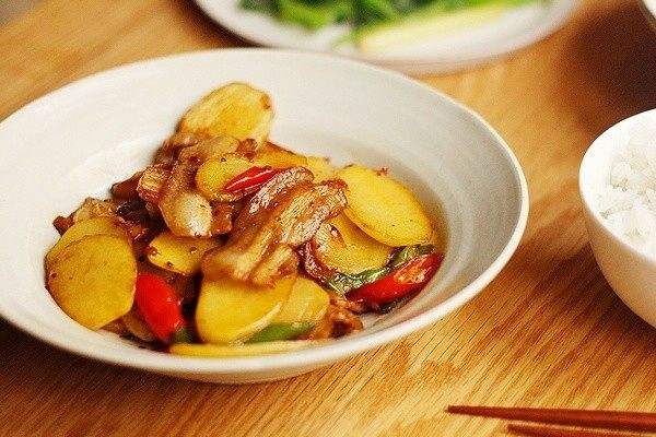 7、 倒入五花肉片和土豆片, 加入料酒翻炒,加生抽,细砂糖,鸡精翻炒均匀。