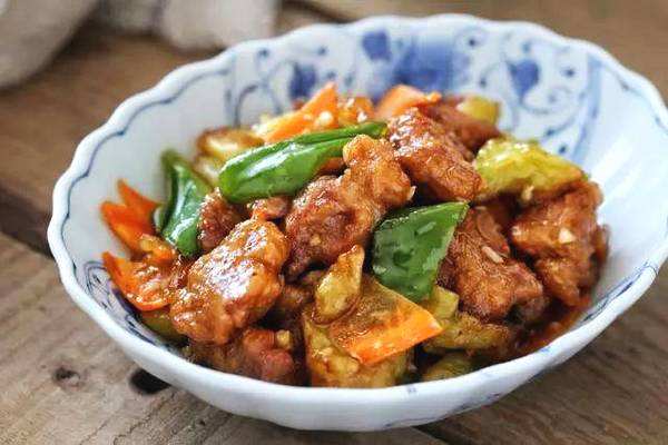 8、锅中放一点底油,爆香姜,蒜,放入青椒和胡萝卜片翻炒几下倒入肉段。