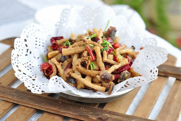 鲜茶树菇300克、五花肉片100克、姜1块、独蒜1个、干辣椒5个、鲜小米辣4个、黄酒几滴、酱油1汤匙、蚝油1汤匙、盐适量、花生油2汤匙。