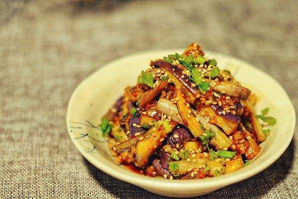 4.将提前准备好的葱蒜辣椒丁丁加点生抽爆香,加盐调味,和茄子条拌匀即可。