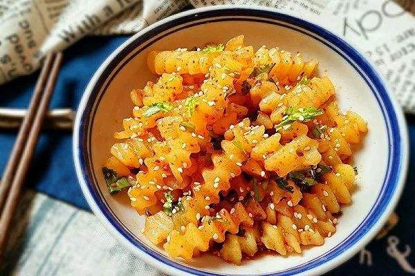 2、土豆用花刀切成1厘米的粗条。