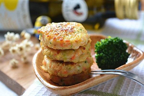 7、放葱花拌匀,平底锅小火烧热,放1汤匙花生油,推匀,油热后,关火,放用勺子挖一块虾泥,然后轻轻按平,逐个做完后,再开小火,加盖煎制。