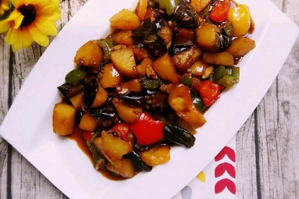 6、然后马上倒入沥干油份的土豆、茄子和青椒,略烧1-2分钟,撒上蒜蓉,加适量水淀粉勾薄芡出锅即可。