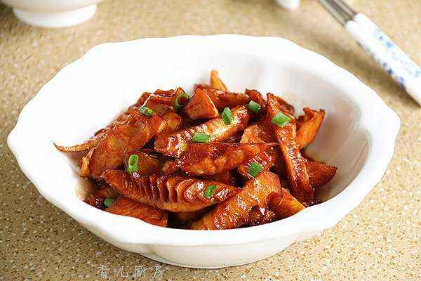 油焖春笋是一道特色传统风味菜肴,属浙菜系。它选用清明前后出土的嫩春笋,以重油、重糖烹制而成,色泽红亮,鲜嫩爽口,鲜咸而带甜味,百吃不厌。