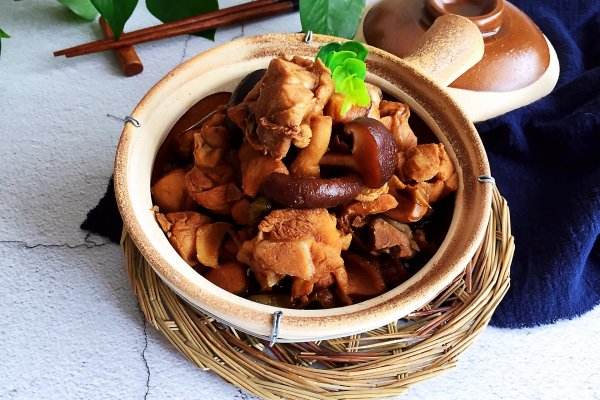 材料准备:鸡腿、香菇、红萝卜、料酒、姜片、大葱、八角、香叶、酱油、蚝油、油、盐