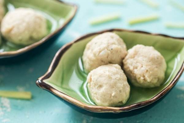 8、 取适量鸡肉泥团成丸子的造型,轻轻倒入汤锅中,小火煮至丸子定型。注意全程保持小火,避免丸子散开。