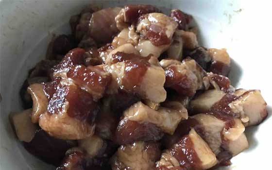 1、五花肉买回来,洗干净,切成块。倒入料酒两勺,耗油一大勺,生抽三勺,老抽一勺,姜块三四片,抓均匀,盖上保鲜膜放置冰箱2-3小时。也可以提前一天腌制。更入味。