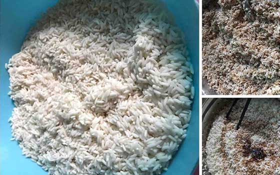 3、糯米淘洗干净,放入盐一勺,生抽三勺,酱油两勺勺,耗油两勺,拌匀。