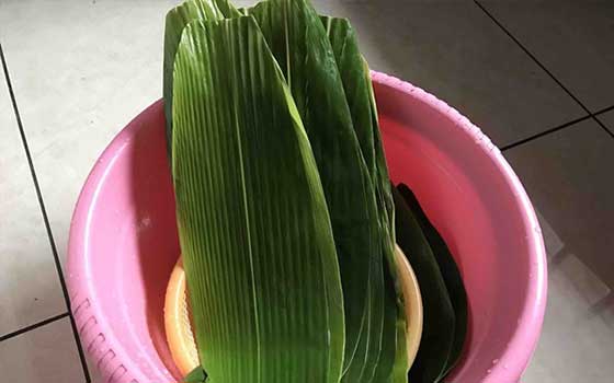 4、粽叶清洗干净,一片片洗,小心边扎到手哦!洗干净后,根部剪掉一点点。以免包起来太硬扎破粽叶。