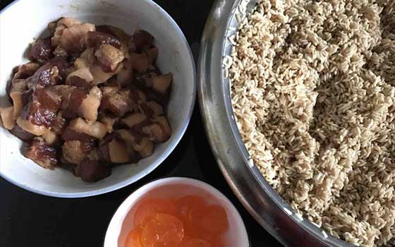 8、粽子包好后,高压锅放水,放入粽子,盖上盖子按蹄筋类肉的蒸煮时间进行蒸煮。