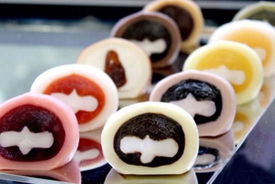 每个和果子都有三层,外一层为冰皮糯米,第二层为各种味道的馅料,里面为奶油。有黑巧克力、樱花、栗子、抹茶、红豆、哈密瓜、柠檬蜂蜜、桃子、蓝莓、草莓。